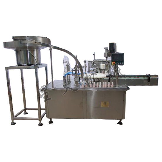 這款振蕩理瓶灌裝旋蓋一體機(jī)專門針對小劑量的藥液、口服液、飲料、保健品、香水等液體灌裝設(shè)計(jì)的 、尤其適用于1ml-10ml容量的灌裝 。采用單頭蠕動(dòng)泵灌裝,316L不銹鋼材料;工作臺面以不銹鋼材料防護(hù),整機(jī)符合GMP要求。采用振蕩式理瓶、圓盤定位灌裝,有自動(dòng)對口裝置,自動(dòng)上蓋旋蓋,定量灌裝,計(jì)量準(zhǔn)確。特別適用于中小批量的生產(chǎn)可選購防護(hù)罩!