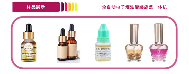 該機(jī)主要適用于50毫升以內(nèi)電子煙油、滴眼液、指甲油、眼影、精油等產(chǎn)品的自動(dòng)灌裝、加塞和旋蓋。